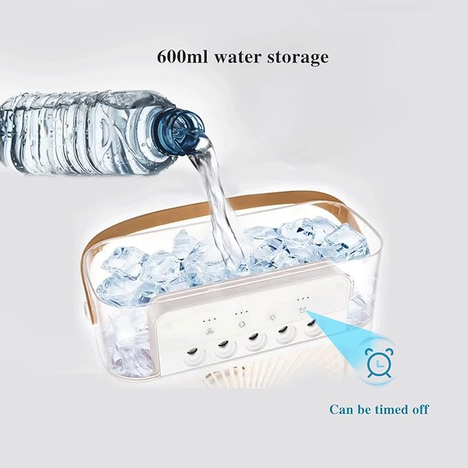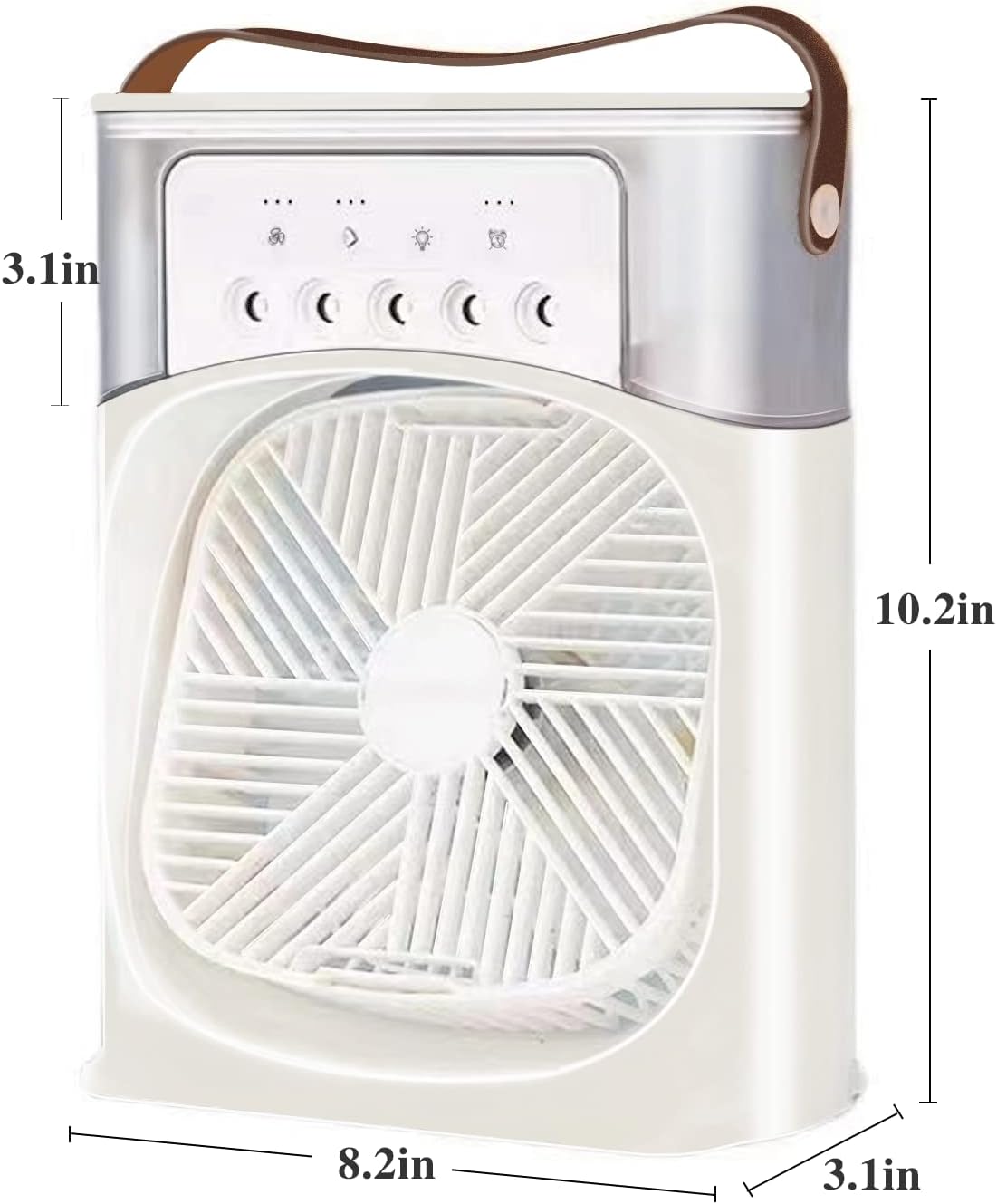 Mini aire acondicionado portátil 4 en 1 con ventilador, enfriador evaporativo, humidificador y luz LED. Funciona con agua, hielo y USB. Compacto, práctico y sin instalación.